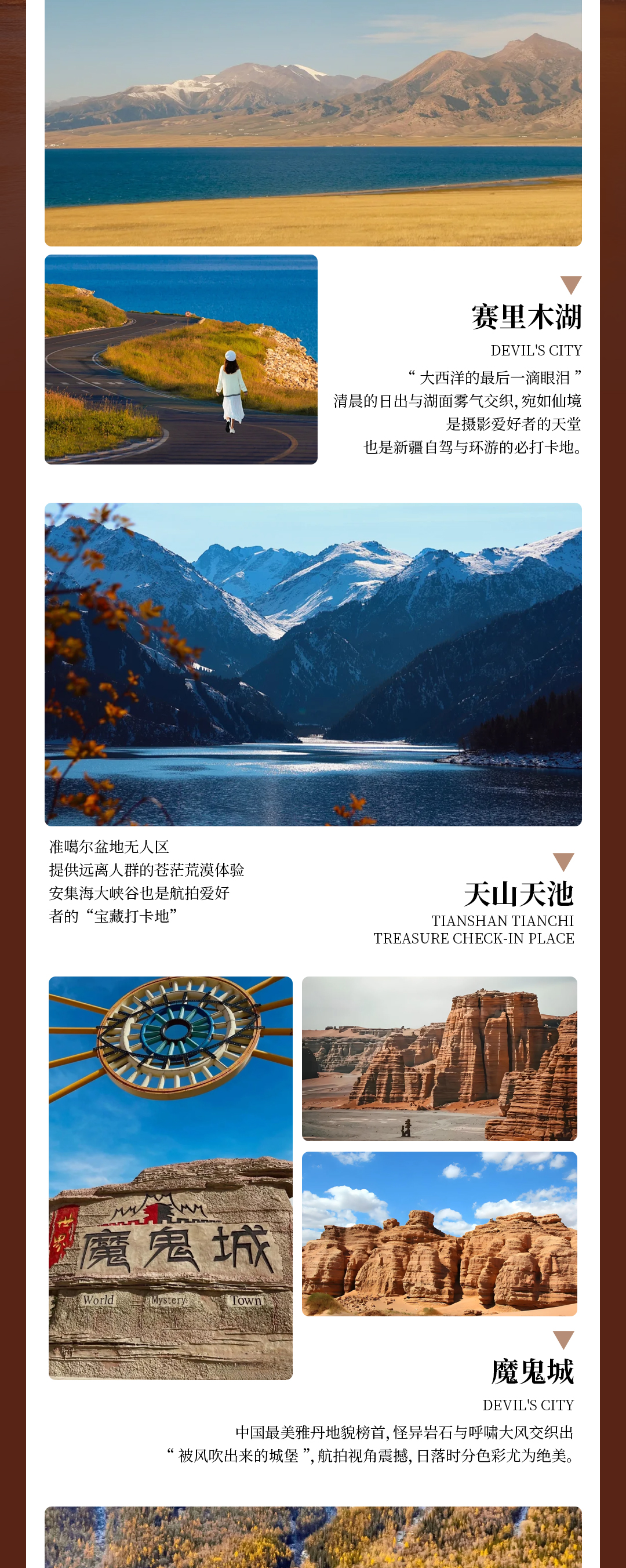 2.门票:天池门票+区间车,额尔齐斯峡谷门票+区间车,阿伊果孜矿洞门票+区间车,禾木门票+区间车,喀纳斯门票+区间车,乌尔禾魔鬼城门票+区间车;赛里木湖门票+区间车