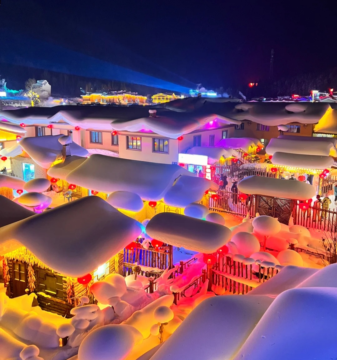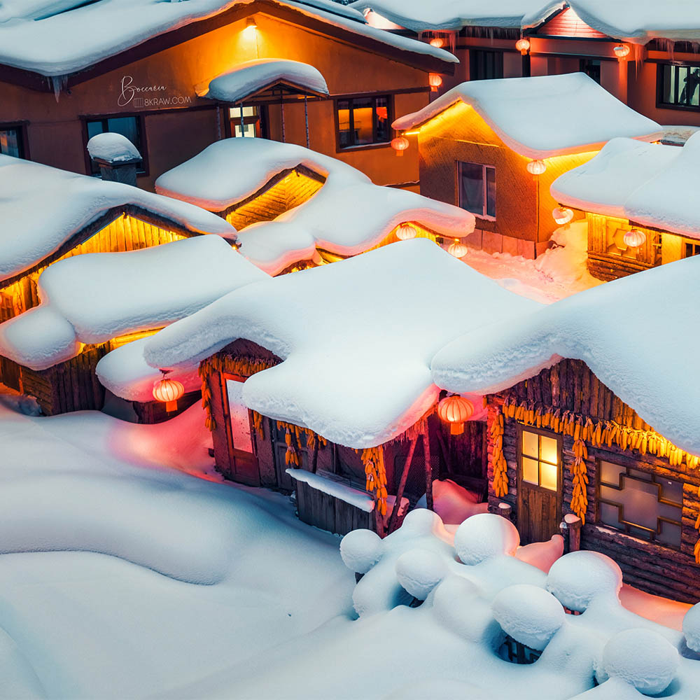 晚上 (约16:00之后):抵达雪乡,入住特色火炕民宿。晚餐后,游览雪韵大街,欣赏雪乡迷人的夜景,红灯笼映衬着雪屋,非常梦幻。