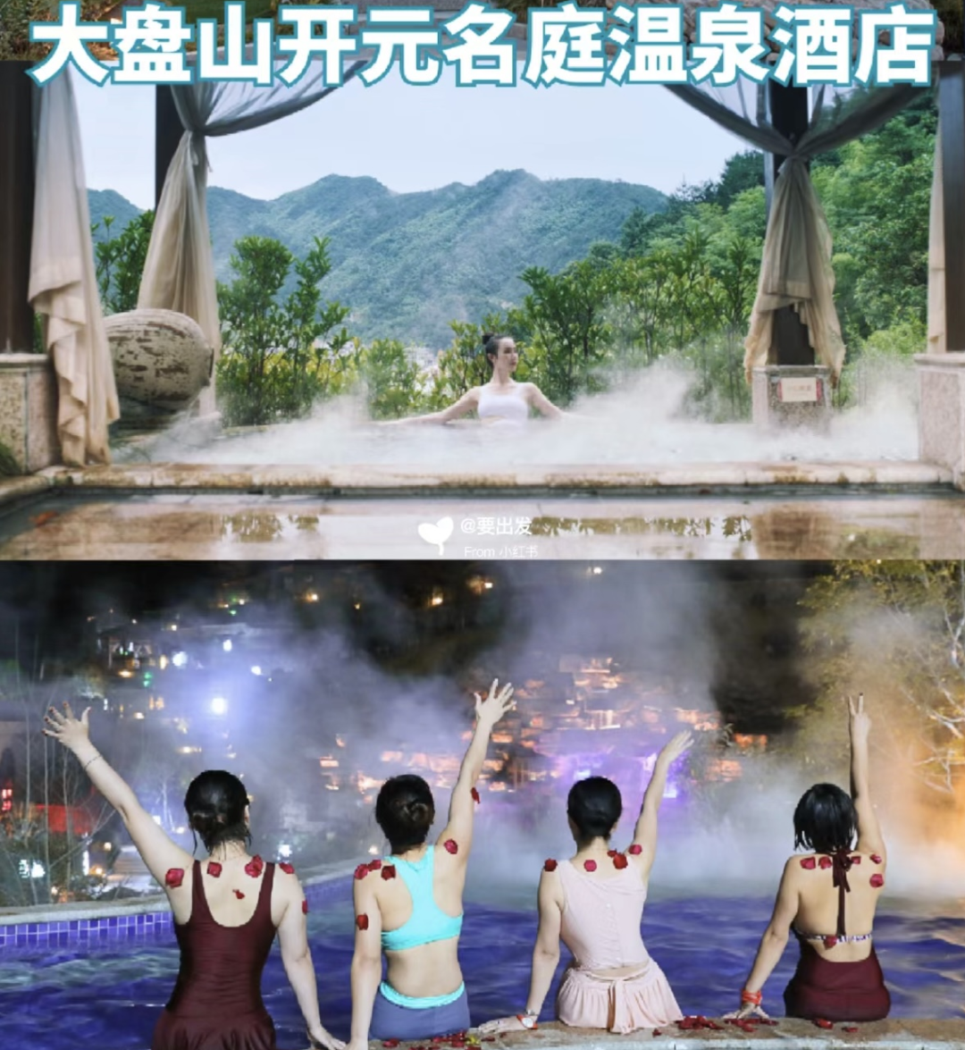 17:30左右,前往大盘山温泉,可以尽情的到“人间仙泉”的火山温泉放松一番【含】。富含氟、铁、偏硅酸和其他微量元素等有益成分,矿物质含量丰富,水质好。可起到舒经活血,强身健体,润肤养颜,安神定神,抗衰老等保健作用。晚上入住到【开元名庭温泉酒店】,主打休息好!
