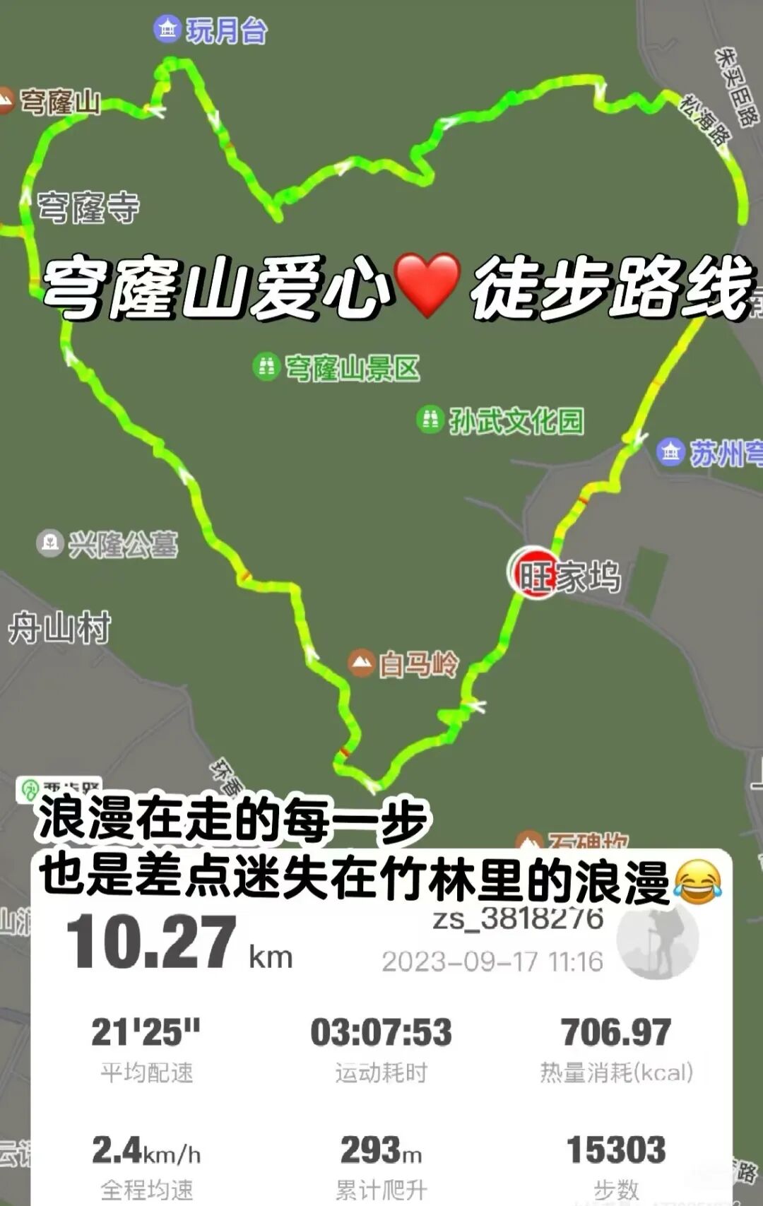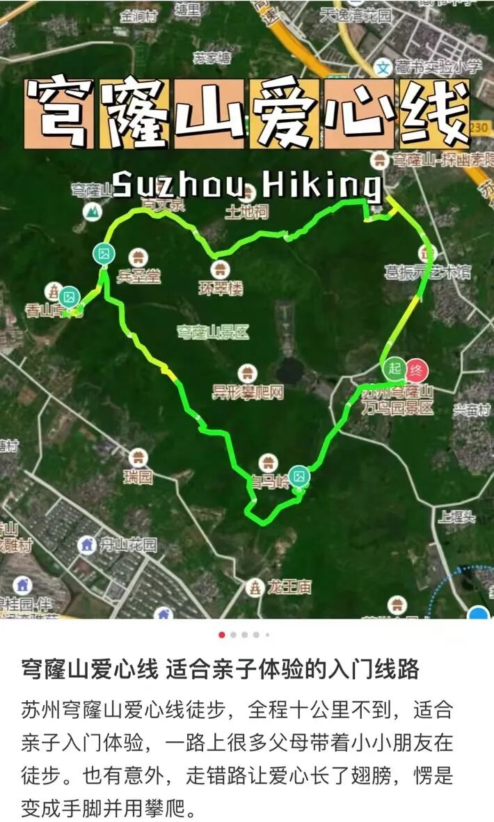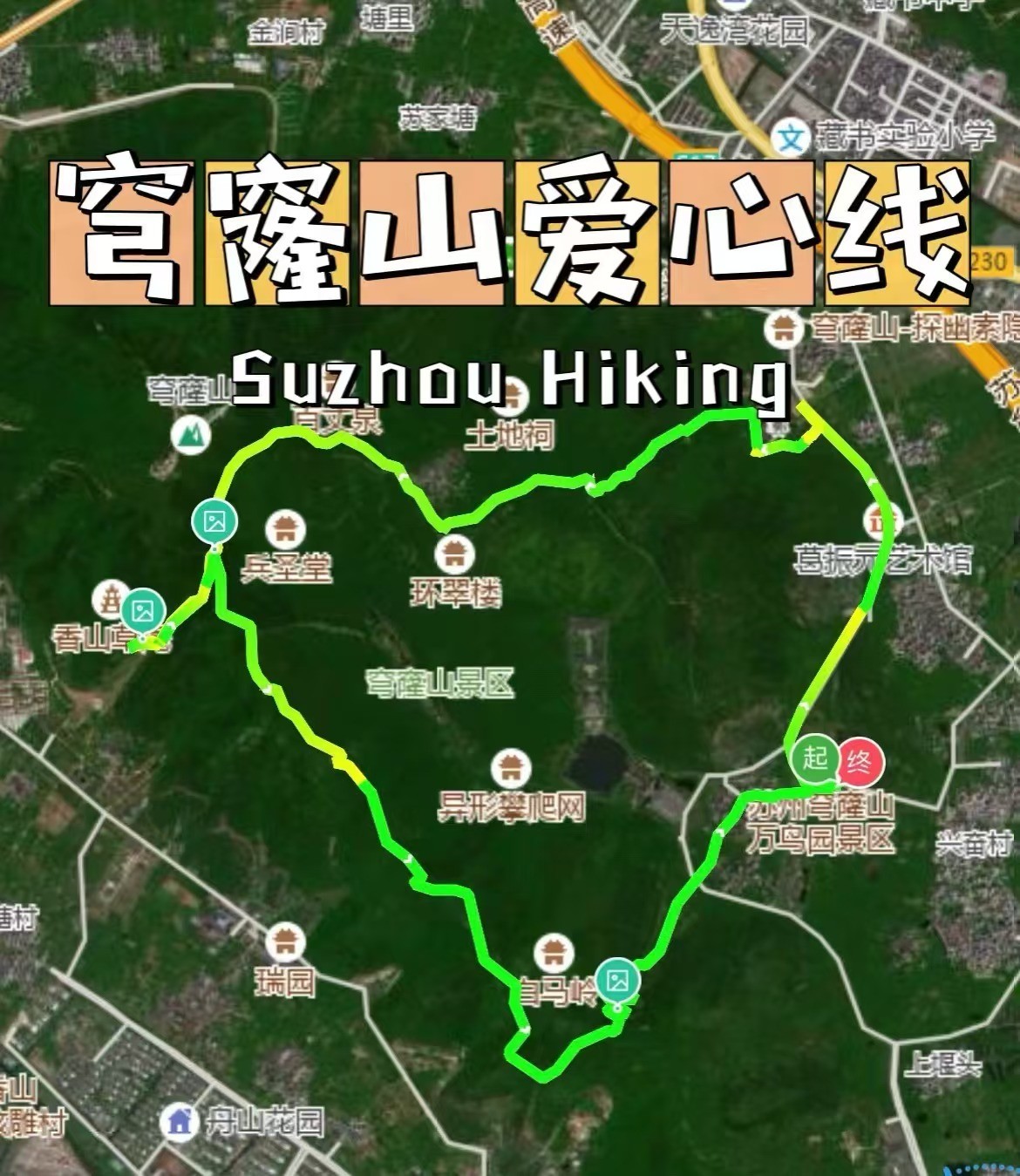 【穹窿山爱心线】:穹窿山景区,地处姑苏西部,为苏州第一名山,海拔341.7米,素有“吴中之巅”之称。此山气势雄伟,地域宽阔,苍松翠竹,山色秀美,如入仙境历史悠长,《孙子兵法》诞生地,乾隆皇帝六次祈福地人文景观丰富,集政治、军事、宗教、文化于一山。