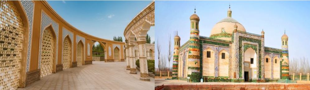 【香妃墓】:始建于公元1640 年前后,是一座典型的伊斯兰古建筑群,也是伊斯兰教圣裔的陵墓,占地2公顷。香妃墓就像一座富丽堂皇的宫殿,由门楼、小礼拜寺、大礼拜寺、教经堂和主墓室5 部分组成。