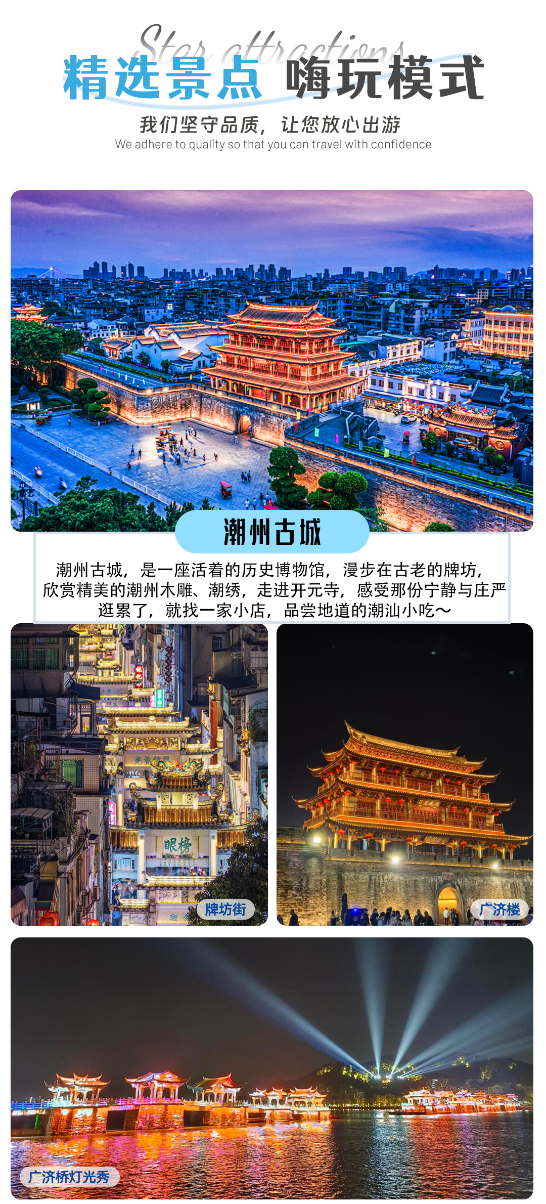 ③行程中未提到的其它费用 :如特殊门票、游船(轮)、景区内二道门票、观光车、潮州古城景交车、缆车索道、动车票等费用。