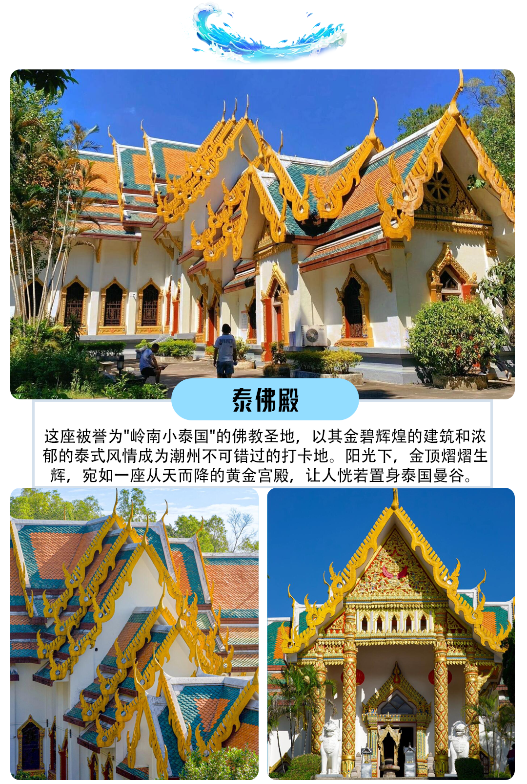 【泰佛殿】潮州小泰国、位于韩江大桥东侧,慧如公园对面,是旅泰侨领、大慈善家谢慧如(1913—1996)捐巨资敬建。泰国的寺庙有泰国艺术博物馆的美誉,在名城潮州建成的这座仿泰国云石寺的建筑物,极富泰国特色,重檐多面式屋顶装鱼鳞瓦、封檐板装向上的黄色图形,柱头翘角是龙凤呈祥之意,山墙的装饰、门窗的顶尖形集中了泰国古代的造型艺术,充分体现了雄奇、精巧的异国情调。足不出国就能领略异国风采;对于侨居泰国的潮人更有一番情趣。