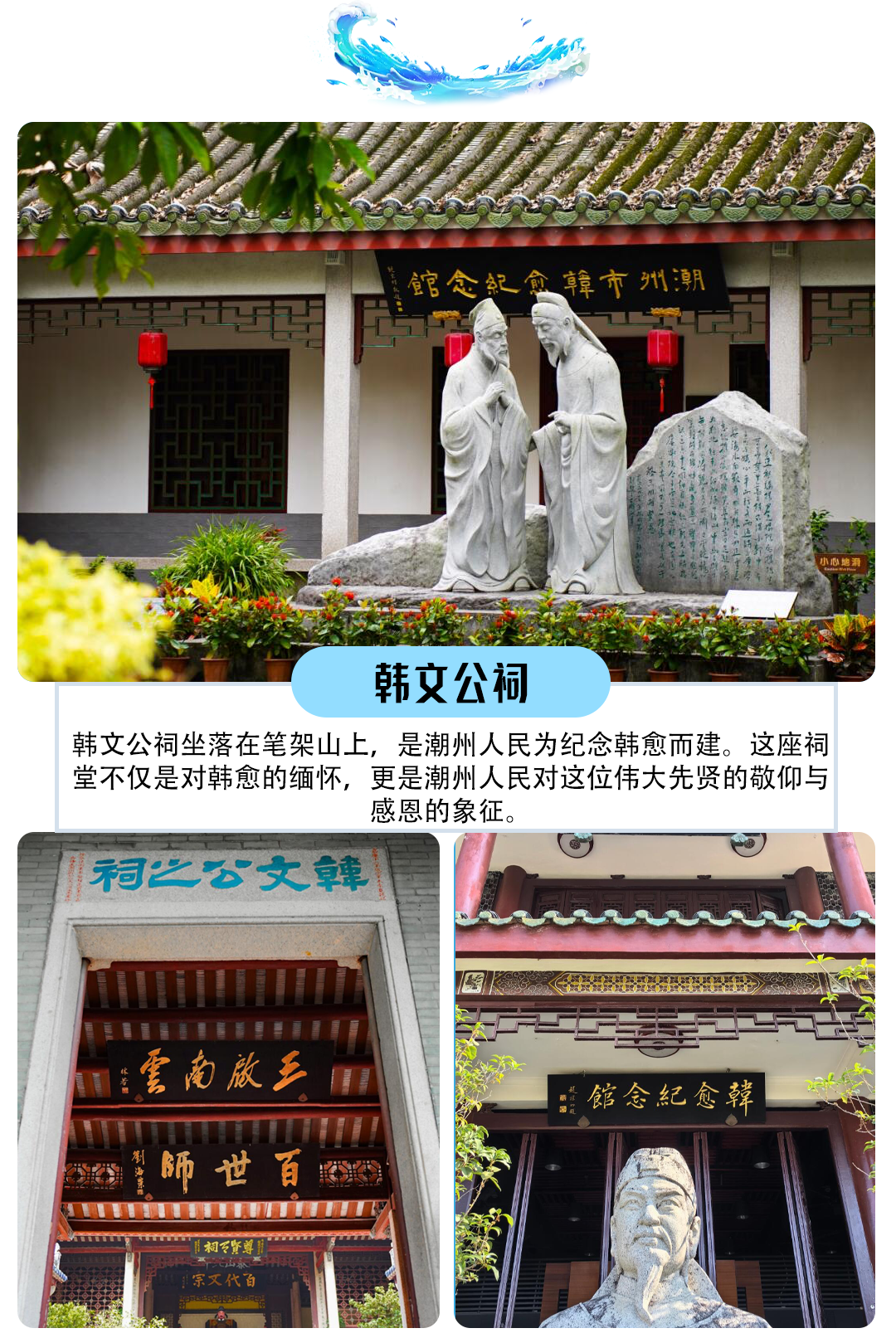 【韩文公祠】(逢周一闭馆国家法定节假日除外),中国现存最早纪念唐代文学家韩愈的祠宇,背靠韩山,面临韩江。主体 建筑分前后二进,祠内梁间遍挂名家题写匾额。祠体正面淡绿色的壁面,衬托着当中凹肚门上方“韩文公之祠”蓝色隶书 匾额之清淡文雅与沉静端肃。亦因曾为电影《羞羞的铁拳》的取景地而更广为人知。