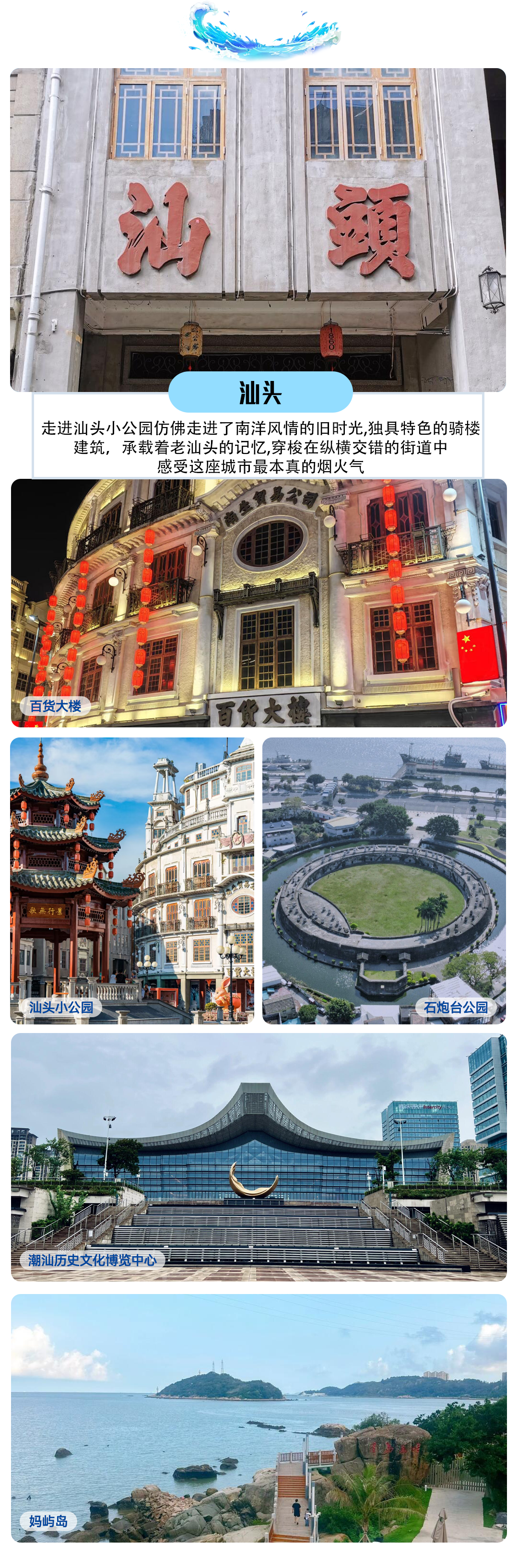 【石炮台公园】汕头构筑奇巧,是古代军事设施,石炮台公园是在崎碌炮台原址上扩建的一个园林式公园,总面积58000平方米。车赴前往中国离海最近的潮汕历史文化博览中心(周一闭馆,参观时长约90分钟)。一共汇聚4个潮人文化展馆:【潮汕非物质文化遗产展示馆】、【潮汕华侨历史博物馆】、【汕头市城市规划展览馆】和【汕头美术馆】(游览时间约90分钟)等。博览中心以“潮都重器”为名,地上5层,地下1层,建筑高度46.2米。设计元素汇聚潮汕文化精髓,建筑风格取材自极具潮汕韵味的山海特色、红头船、潮汕民居, 形成“风起沙汕、潮送玉舟”,“花开四海、叶落归根”,“玉堂金殿、南滨新厝”,“鲲鹏展翅、遨游万里”四组具潮汕文化内涵的设计意象,为潮人之都增添文化重器。潮汕非物质文化遗产展示馆汇聚了潮汕地区大量的精美艺术品,用多种形式展示潮汕三市已申报核准的国家级、省级、市级非遗项目。从集聚地方传统建筑技艺的潮汕老厝里,有嵌瓷、木雕、石雕、彩画等技艺,接近1:1比例仿制潮州从熙公祠门楼,潮州木雕、陶瓷微书、抽纱、潮绣、金漆木雕神龛、印章镌刻技艺、珠绣等实物展品。非遗馆第二展厅使用各种大型现代装置来展示潮汕非遗项目,可近距离观看非遗项目潮剧的各种服饰、袍服的潮绣、冠帽的制作,还在潮剧戏服试穿戴系统前,挑选自己喜欢的角色,穿上冠帽袍服,打卡发上朋友圈。【潮汕华侨博物馆】通过一幅幅珍贵的照片、一件件历史实物,诉说着当年潮汕华侨背井离乡、远渡重洋漂洋过海打工的艰辛,以及剖析为何后来遍布全世界各地富豪,潮人经商的文化基因!