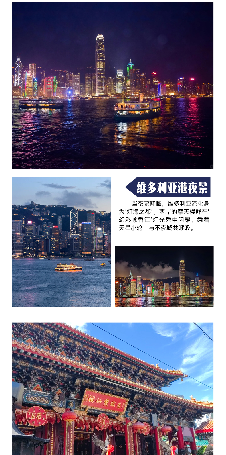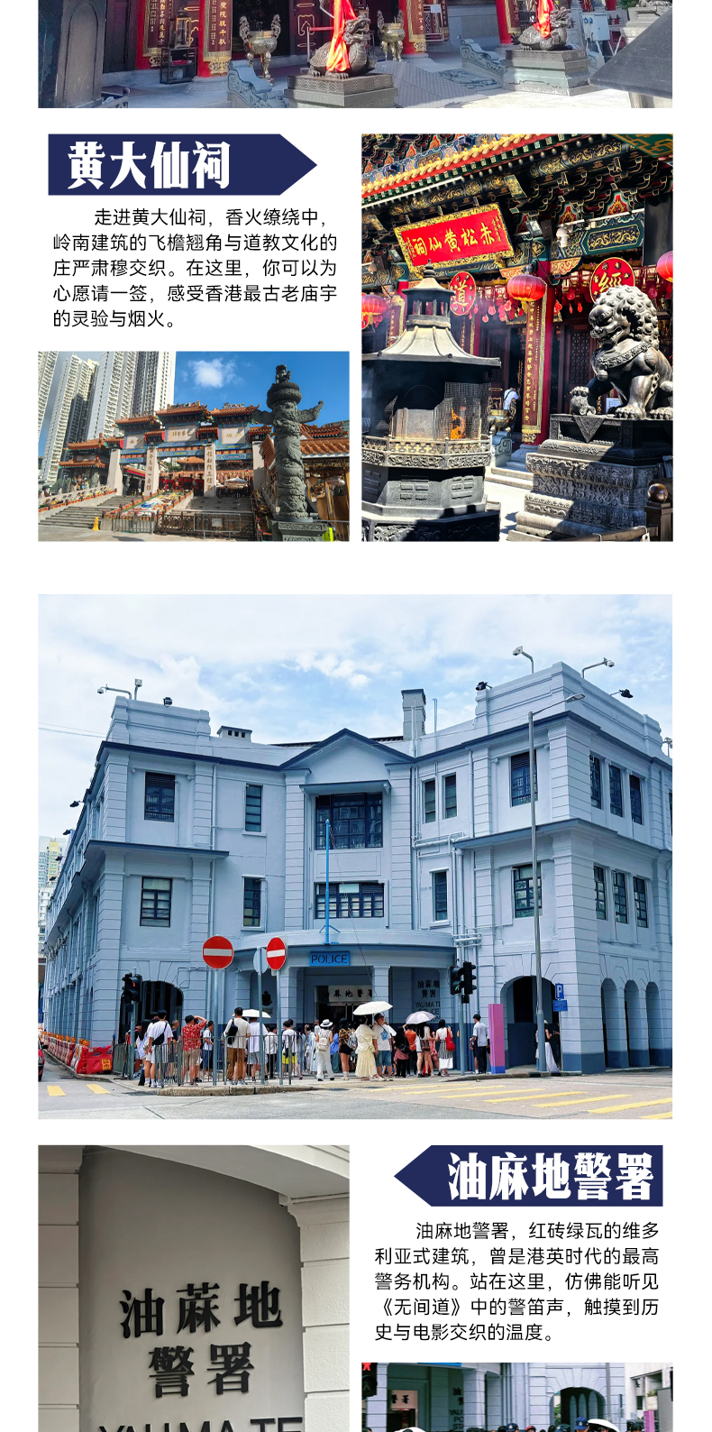 做地铁或者巴士,依次游玩黄大仙祠、油麻地警署、太平山、尖沙咀钟楼等景点