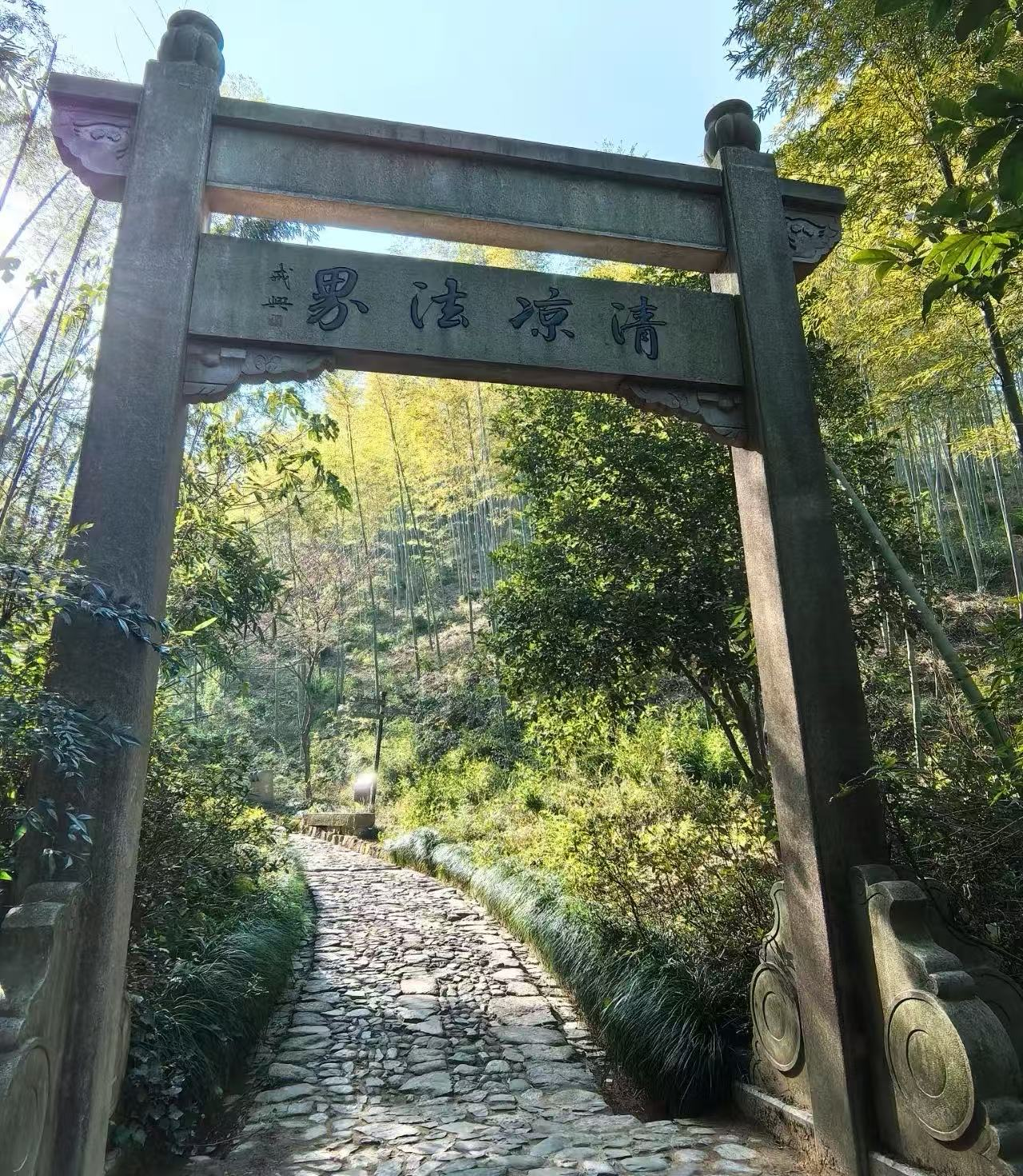来到径山脚下,古道石碑屹立在上山口,为来往行人指引径山寺的道路,古人云:“百万峻松双径皙,三千楼阁五峰寒”,我们沿着石板路开始上山,竹林掩映,阳光斑驳地洒在山林中,古道在山间延伸,领着我们走向1200余年的径山寺,沿途有不少观景台,可供短暂休憩。