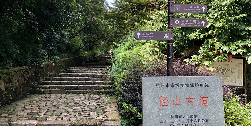 径山古道是鉴真大师东渡日本传戒律时从余杭径山寺到临安白马寺走过的山路。青石板路面,山泉汩汩流畅,古道两侧山崖陡峭,古树参天,据传古树已有500多岁了;还有那片片竹林葱郁苍翠,笔直静默地生长。