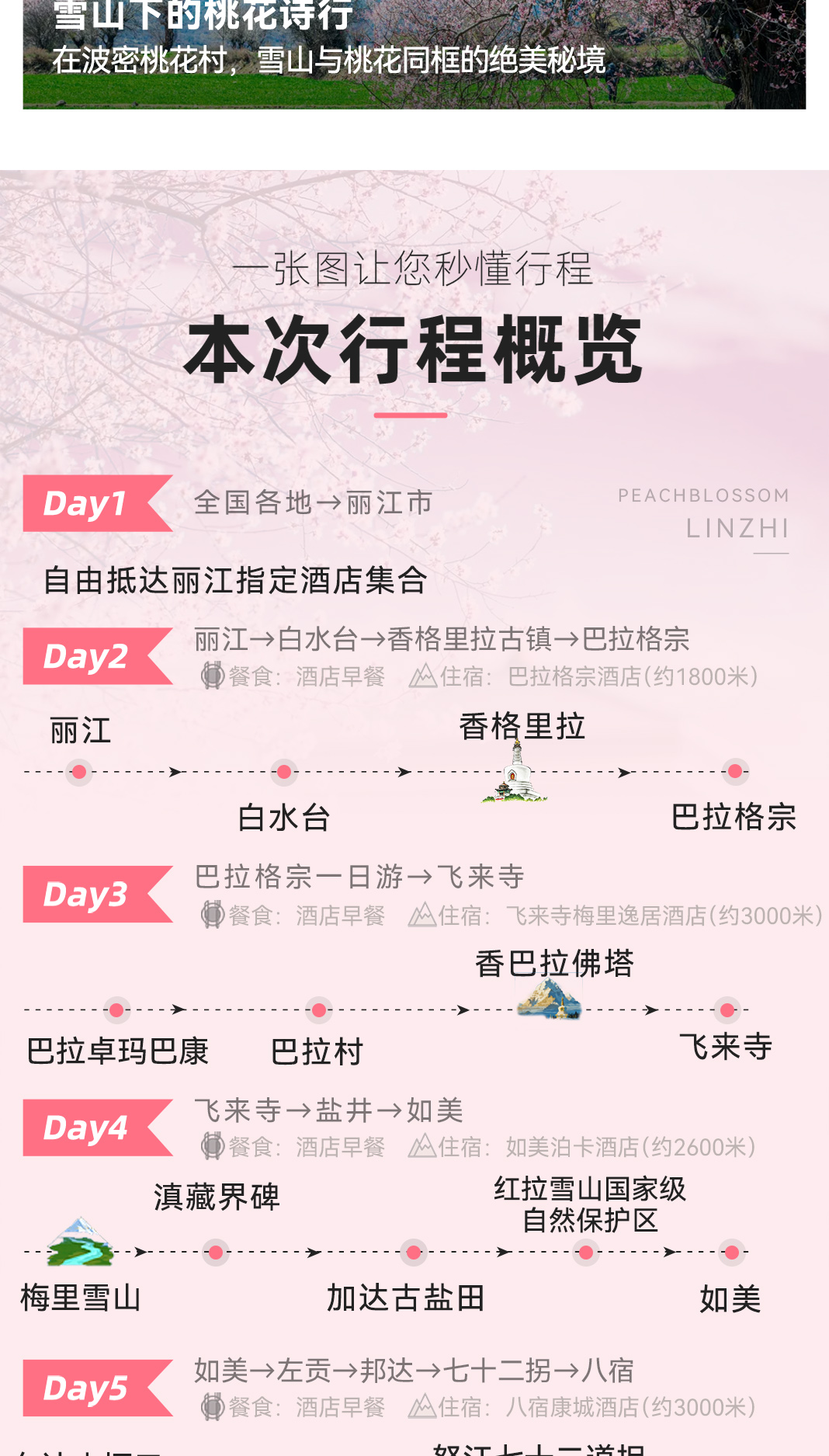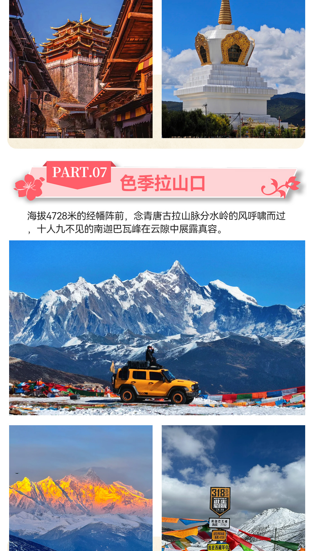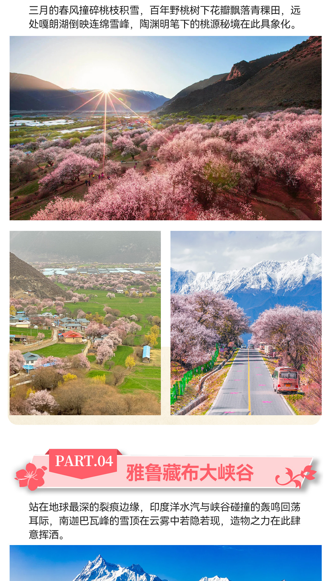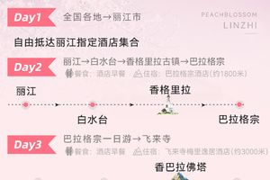 早餐后出发秘境桃花村,下午一路经过排龙大桥、【通麦大桥】,高山峡谷中的斜拉桥雄伟壮观,曾经令人心惊肉跳的通麦天险一去不复返,天堑已变通途。穿过素有西藏瑞士之称的【鲁朗小镇】,游览鲁朗林海观景台。随后抵达海拔4702米的【色季拉山】垭口。有时云雾缭绕,有时晴空万里,可以目睹【南迦巴瓦峰】的英姿。下山后便到达林芝地区,入住酒店休息。