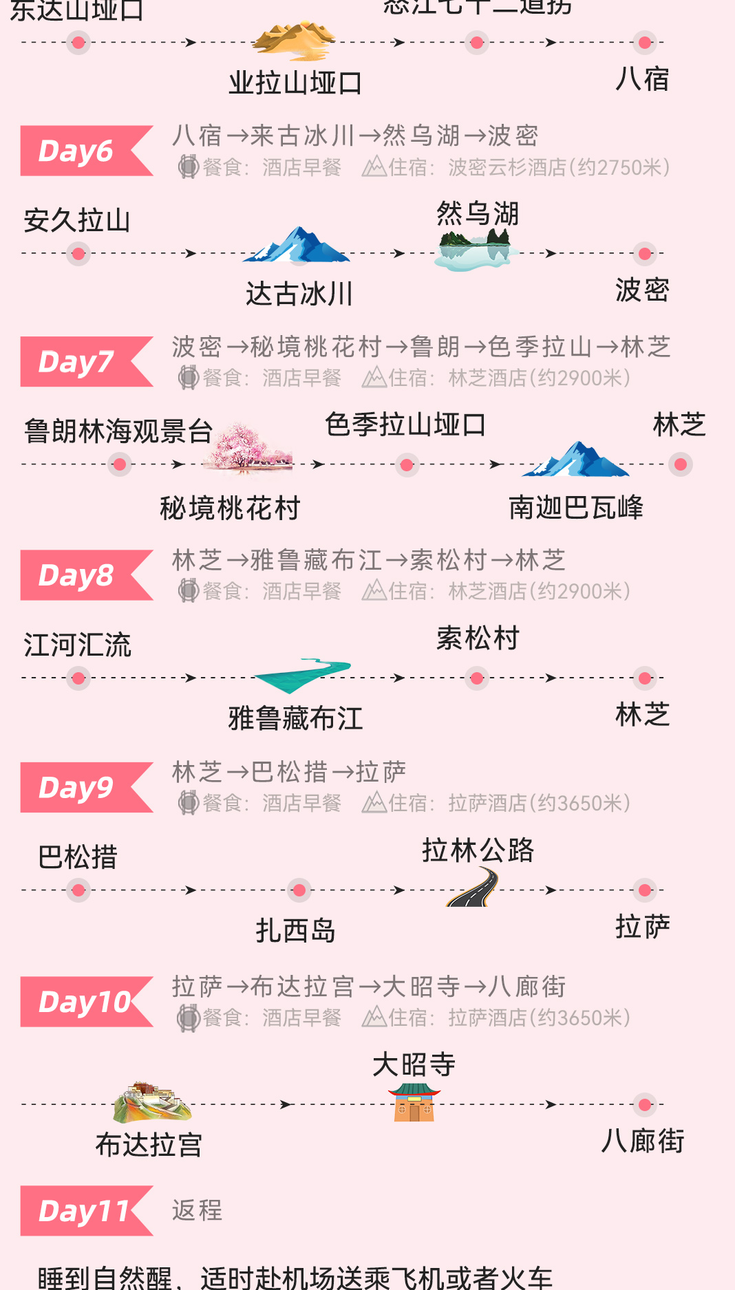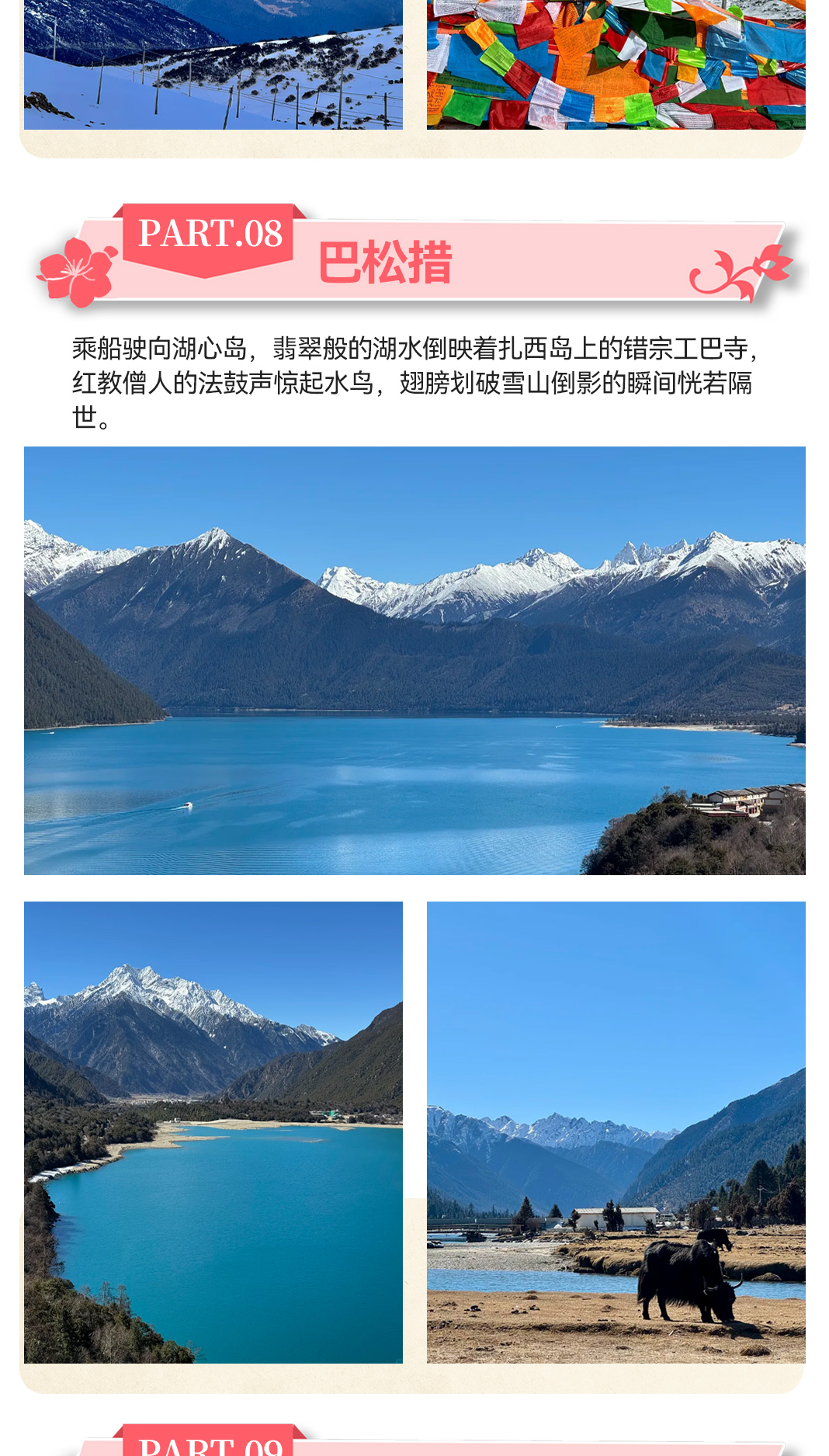 用过早餐之后沿着雅江逆流而上,一路前行,到达巴松措景区,又名措高湖,藏语中是“绿色的水”的意思。湖水清澈见底,四周环绕的雪山倒映其中。湖中的【扎西岛】上,宁玛派(红教)寺庙【错宗工巴寺】据传始建于唐末,很有工布特色的将原始崇拜与藏传佛教信仰相结合。【拉林公路】被称为中国最美公路,从“日光之城”拉萨到“雪域江南”林芝,全程的每一公里都是如画风景,美不胜收。最后沿着拉萨河前行,抵达圣城拉萨,晚上可自行前往【布达拉宫广场】欣赏布宫夜景。