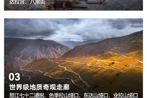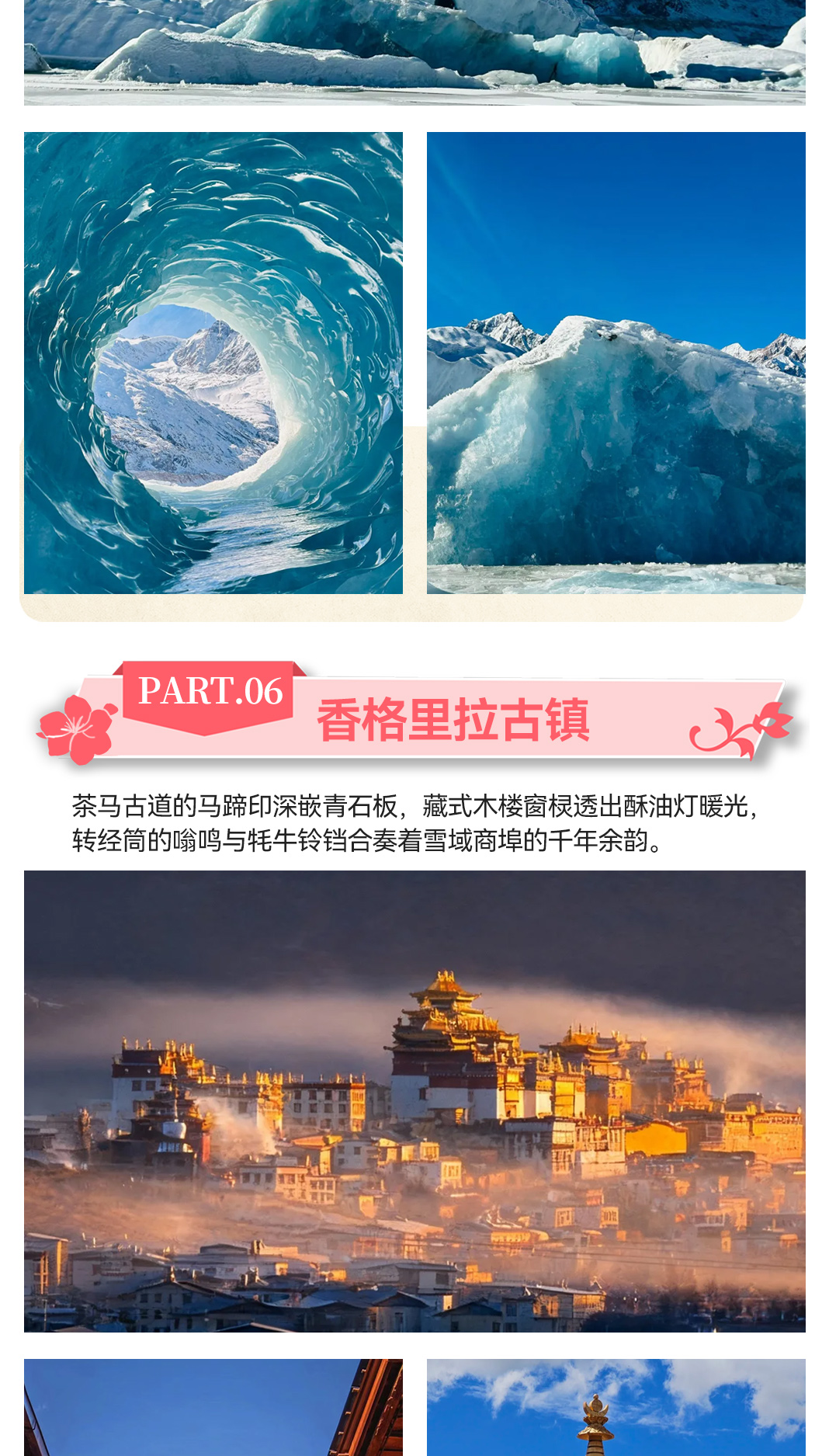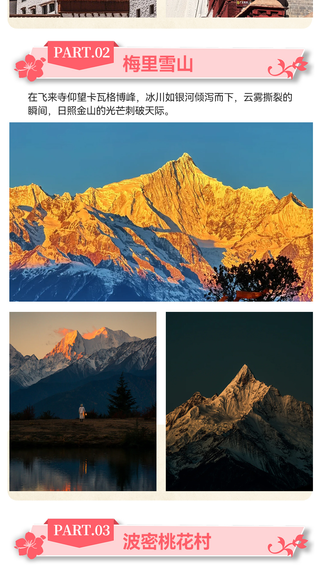 巴拉格宗一日:巴拉卓玛巴康:(21渡母)千年前,在度母经堂基础上修建的一座观音庙,供奉了21尊度母,是拯救苦难众生的女神;巴拉村:1300年前的古村落,逃离遥远的战乱定居于此,只有骡马道与外界相通,传奇人物斯纳定珠散尽家财修通了天路才让世人知晓;回音壁:人工建造的高空玻璃栈道,垂直落差700米,仰望苍穹雪山胜景,壁立千仞,对着崖壁呼喊,会有层叠连绵的回音;香巴拉佛塔,大峡谷,千年菩提树。驱车前往飞来寺,看看今天的运气怎么样日落金山的美景在等着我们。