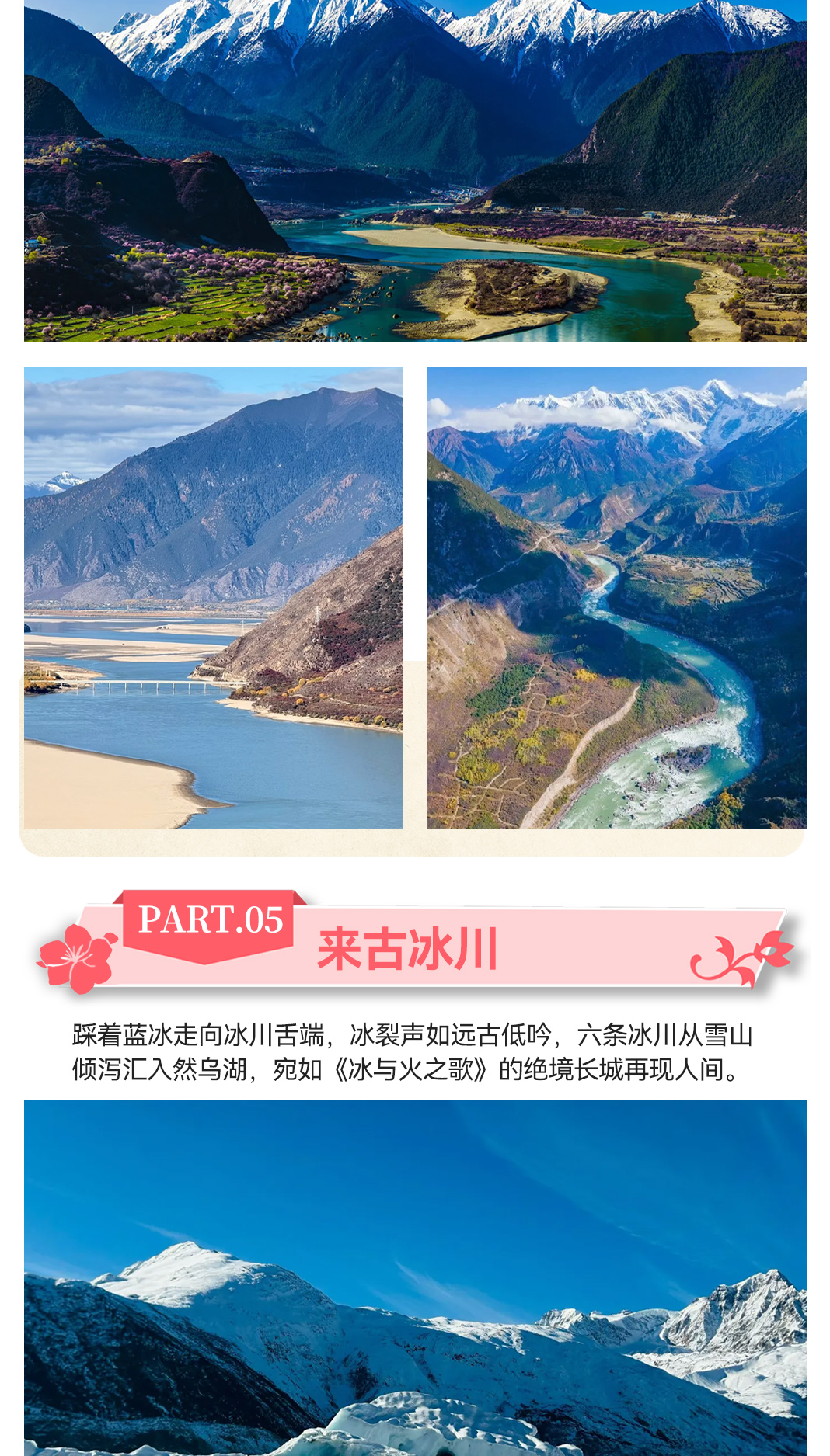 早餐后前往雅鲁藏布江大峡谷景区,沿途会经过【尼洋河】和雅鲁藏布江的【江河汇流】、佛掌沙丘。【索松村】背靠神山南迦巴瓦峰,面朝【雅鲁藏布江】,严格来说索松村才是拍摄南迦巴瓦的最佳地点,云雾缭绕的雪山和山脚辽阔的农田牧场,最震撼的是两座海拔7000米以上的加拉白垒峰和南迦巴瓦峰的隔江对峙。游览完返回林芝入住。