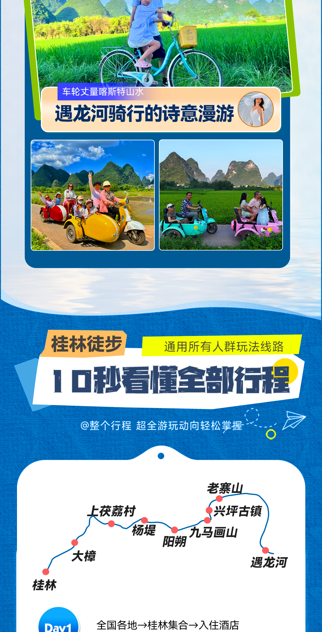 上午遇龙河骑行十里画廊,电瓶车骑车,车程大约18公里 ,环线,最后还是回到酒店,中途有多个打卡点