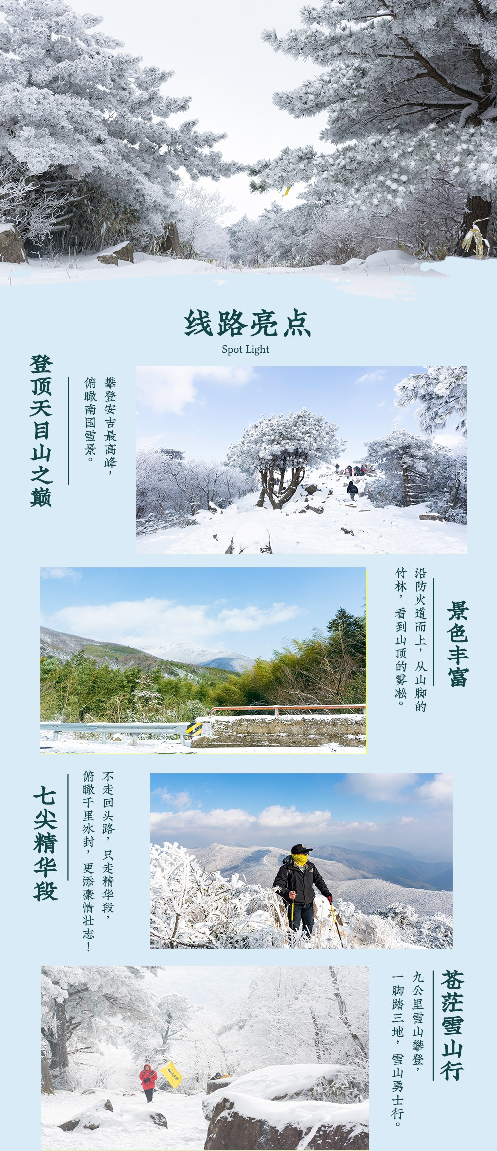 【踏雪行山】:每年的隆冬时节,正是浙西群山被白雪覆盖的季节,行走冰雪中,体验不一样的登山乐趣
