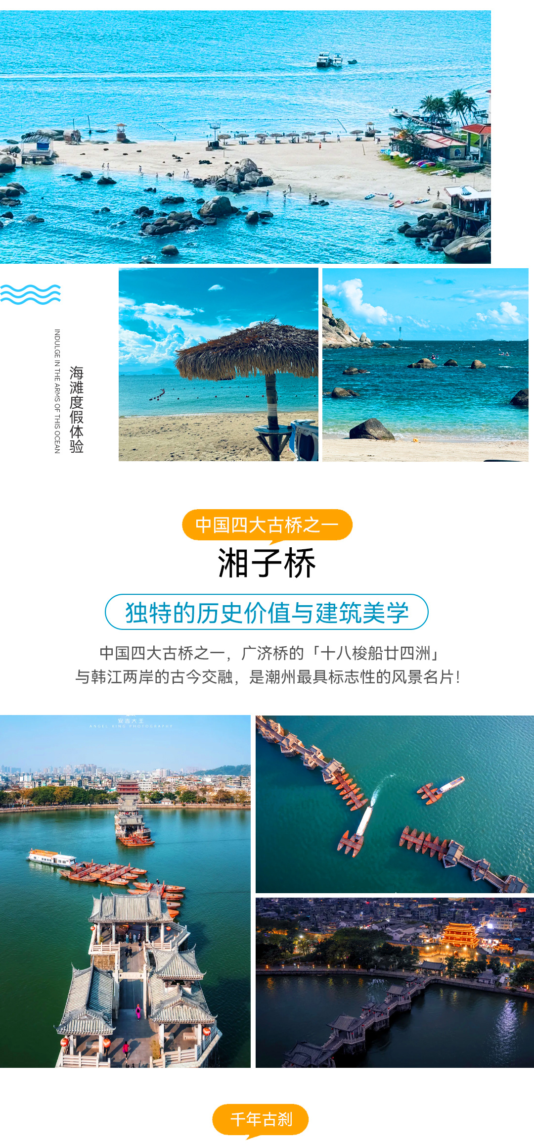 —驱车前往潮州,前往“华侨之乡”之称【潮州古城】,登我国的四大古桥之一“过河拆桥”【湘子桥】,又 称“广济桥”,是我国第一座启闭式石桥,设计非常独特。两边是石墩,有精美的亭台楼阁,中间则是 18 座古浮桥相连,在浮桥上走一走,感觉十分奇妙;游览千年名刹【开元寺】皇家寺院,整座寺院保留了唐代平面布局,欣赏潮汕古代寺庙巧夺天工的建筑工艺。